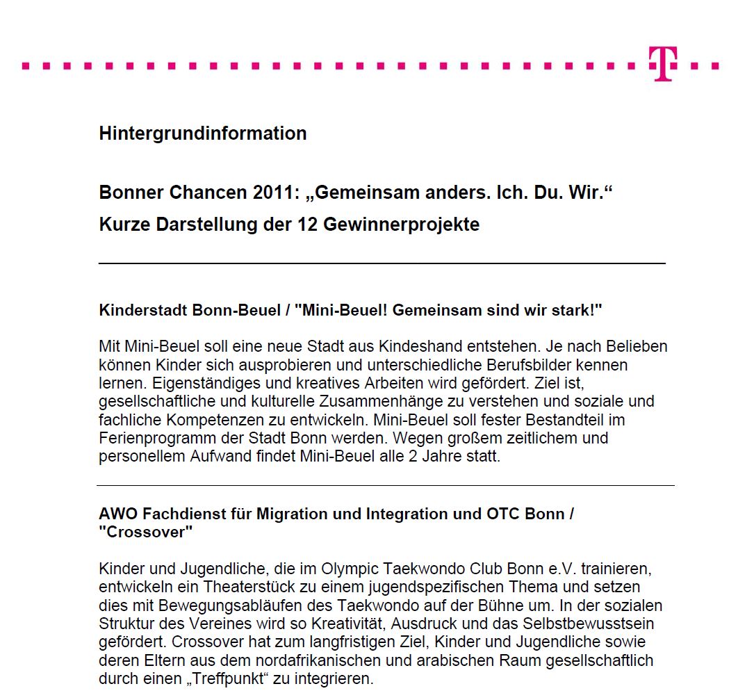 Den Wettbewerb „Bonner Chancen“ gibt es seit sieben Jahren, Initiator ist die Telekom in Kooperation mit der Stadt Bonn. Insgesamt gingen 30 Bewerbungen ein, von denen zwölf den Wettbewerb gewannen.