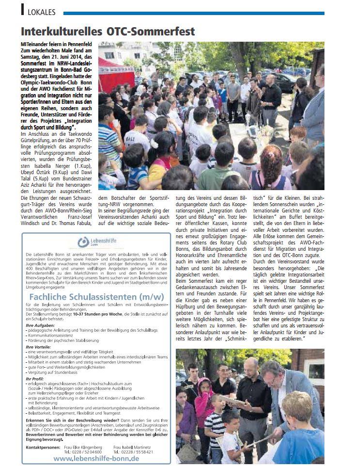 Zum wiederholten Male fand am Samstag, den 21. Juni 2014, das Sommerfest im NRW-Landesleistungszentrum in Bonn-Bad Godesberg statt. Eingeladen hatte der Olympic-Taekwondo-Club Bonn nicht nur Sportler/innen und Eltern aus den eigenen Reihen, sondern auch Freunde, Unterstützer und Förderer des Projektes „Integration durch Sport und Bildung“.