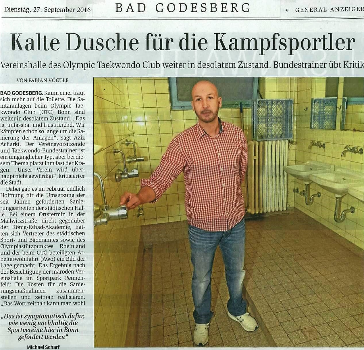GA-Bericht vom 27.09.2016 Bad Godesberg. Aziz Acharki ist sauer. Schon lange kämpft der Taekwondo-Bundestrainer gegen den desolaten Zustand der Trainingshalle an der Mallwitzstraße. Geändert hat sich trotz Versprechungen der Stadt immer noch nichts.